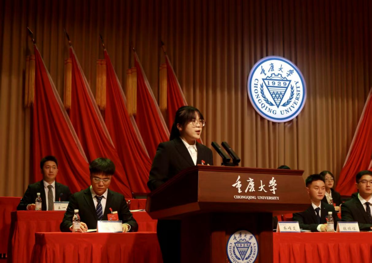 黄丹怡同学代表上一届学生会作题为《高举旗帜跟党走,挺膺担当建新功,团结带领广大同学在建设中国特色世界一流大学中书写青春华章》的工作报告。她回顾了过去一年重庆大学学生会团结带领全校同学在思想引领、学风建设、文体活动、权益服务及媒体运营等方面取得的工作成效,并对下一阶段工作提出建议。